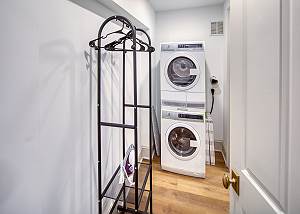 There is a separate room with a stackable washer & dryer, iron/board and spot for the 2nd bedroom guests to hang clothing.