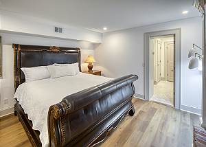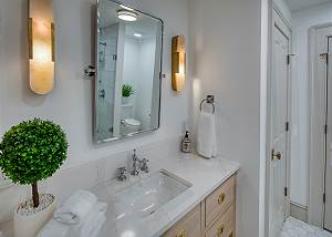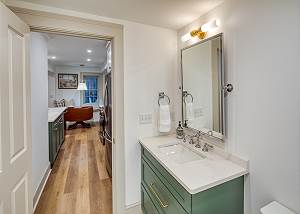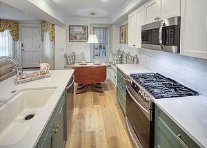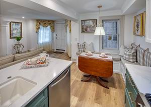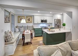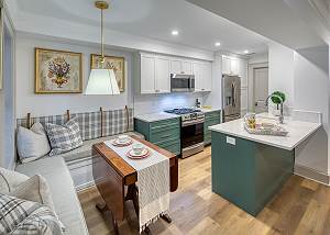 The home is a light-filled with a modern open-concept kitchen, dining nook and living room all open for collective gathering. The kitchen features Quartz countertops, full size stainless steel appliances and plenty of cabinet storage. The dining nook is upholstered with Ralph Lauren inspired fabrics, leather accents and throw pillows. The antique drop-leaf table allows guests to change the size of the table according to game night or dinner.