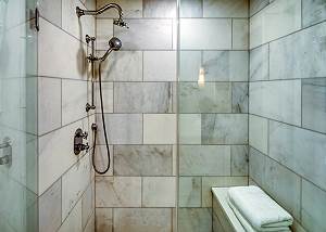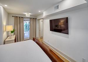 Off the living room is the first of 2 bedrooms with a king size bed, Asian art and spacious closet. Just beyond is the spacious bathroom with a large walk-in shower. Both bedrooms have wall-mounted smart TVs and king size beds.