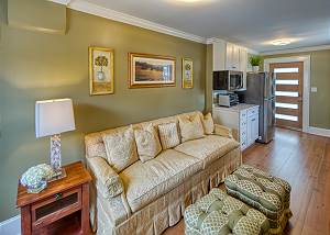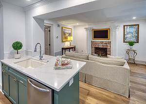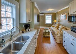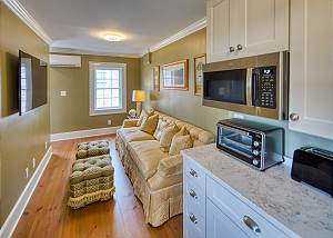 The home is a light-filled with a modern open-concept kitchen, dining nook and living room all open for collective gathering. The kitchen features Quartz countertops, full size stainless steel appliances and plenty of cabinet storage. The dining nook is upholstered with Ralph Lauren inspired fabrics, leather accents and throw pillows. The antique drop-leaf table allows guests to change the size of the table according to game night or dinner.