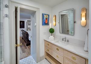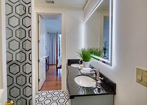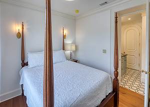 Opposite, two queen bedrooms boast sweeping city views, including the spires of The Cathedral Basilica of St. John the Baptist. These rooms share a full bathroom with a walk-in tiled shower and double vanity with an illuminated vanity mirror.