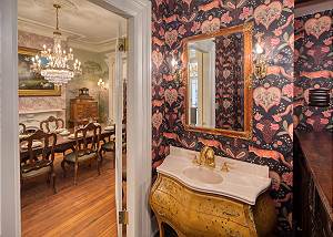 Guests are welcomed into the formal parlor adorned with vintage blue and pink peacock upholstery and an heirloom chessboard-game-table overlooking the Live Oak Trees through the bay windows. Passing through the historic ten-foot pocket doors, you enter the dining room continues the peacock theme with spectacular peacock and floral wall art and banquet table that comfortably seats ten.
