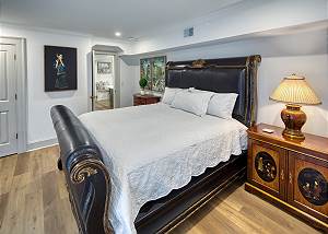 The primary bedroom faces Gaston Street, with windows framing ancient Live Oak trees, a king bed, and a private en-suite bath featuring a lighted mirror, double vanity, large walk-in shower, and generous storage.