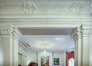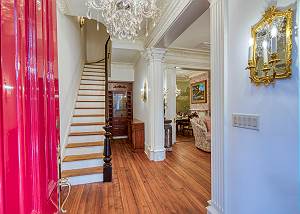 The foyer showcases historic hardwood plank flooring, staircase and a custom designed wine cellar. The entire home showcases opulent cornice moldings and architrave combining wood and marble that frame stunning views throughout the home. The in-depth renovation saved the original fireplace mantles, pocket doors and hardwood floors throughout.