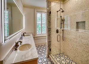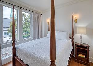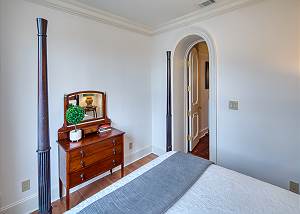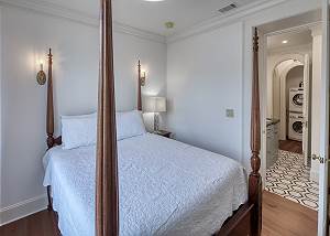The primary bedroom faces Gaston Street, with windows framing ancient Live Oak trees, a king bed, and a private en-suite bath featuring a lighted mirror, double vanity, large walk-in shower, and generous storage.