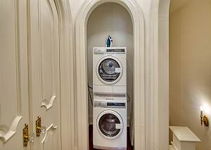 On the third floor, an informal lounge area includes a sofa, chairs, and smart TV. Bedrooms are located on either side, with two full bathrooms. This floor also provides a stackable washer/dryer and iron/ironing board.