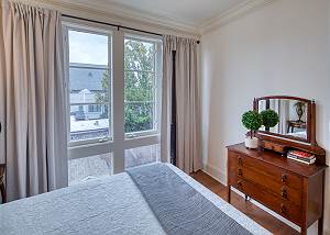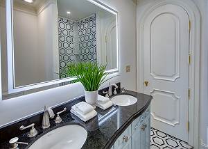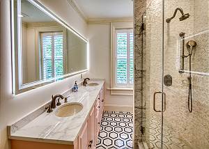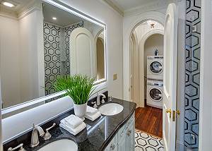 Opposite, two queen bedrooms boast sweeping city views, including the spires of The Cathedral Basilica of St. John the Baptist. These rooms share a full bathroom with a walk-in tiled shower and double vanity with an illuminated vanity mirror.
