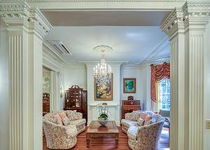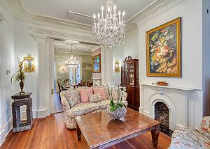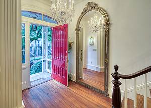 Facing Gaston Street, you’ll notice the 2nd story, bright red lacquered door, shining like a proud peacock, leading to the parlor entrance of the mansion.