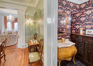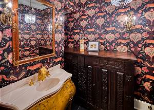Adjacent to the dining room is a powder room featuring a gilded lily faucet, fox-themed wallpaper and local art.