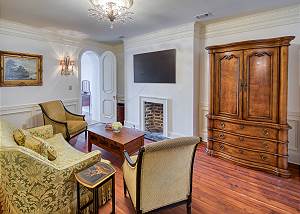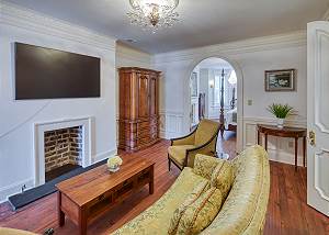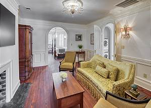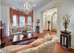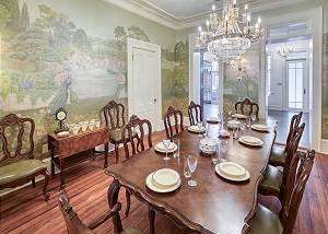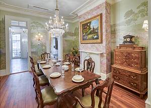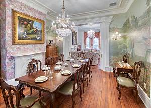 Guests are welcomed into the formal parlor adorned with vintage blue and pink peacock upholstery and an heirloom chessboard-game-table overlooking the Live Oak Trees through the bay windows. Passing through the historic ten-foot pocket doors, you enter the dining room continues the peacock theme with spectacular peacock and floral wall art and banquet table that comfortably seats ten.