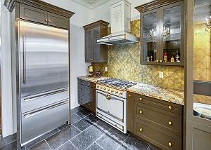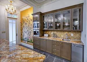 Last but not least, the palatial kitchen includes high-end appliances, gas stove, and the elegant granite island perfect for gathering with wine and charcuterie or watching your family’s favorite chef whip up dinner. The bar includes a second sink and a built-in ice maker. The expansive glass windows offer views of the porch and lush courtyard below.