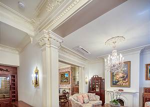 The foyer showcases historic hardwood plank flooring, staircase and a custom designed wine cellar. The entire home showcases opulent cornice moldings and architrave combining wood and marble that frame stunning views throughout the home. The in-depth renovation saved the original fireplace mantles, pocket doors and hardwood floors throughout.