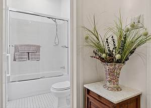 The bathroom has a beautiful vanity built into a vintage oak dressing stand with a lovely marble top and porcelain sink. Double doors open to a separate space with the tub/shower combo, toilet and bidet. A guest is able to brush teeth at the vanity with privacy for someone using the shower room.