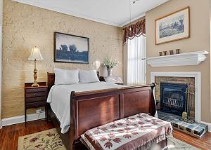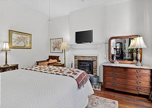 Back bedroom with queen bed & historic coal fireplace [19]