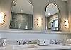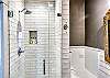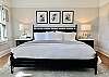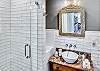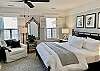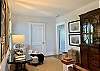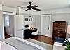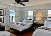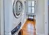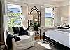 The primary suite features a Ralph Lauren inspired king size bed with a new mattress, luxury cotton linens, chaise and a large desk. The en-suite bathroom has a marble vanity with two sinks and a large walk-in shower. The spacious primary closet includes a full-size washer/dryer.
