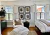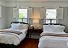The 2nd bedroom faces the front of the home with 2 full size beds, also with new mattresses and luxury cotton linens. There is a chair and ottoman for relaxing under the bespoke artwork made with local flora. This room has a closet and dresser for plenty of storage as well as a small desk for private moments to write or work.